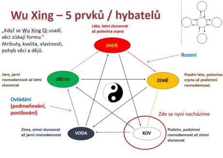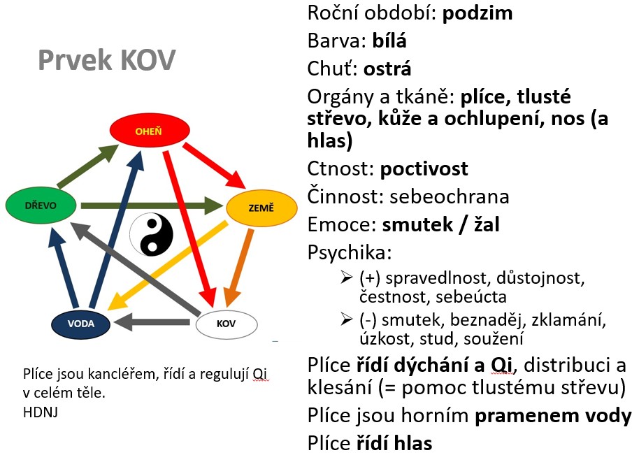 Zatímco VODĚ patří cesty vody, tedy ledviny a močový měchýř, DŘEVU játra a žlučník, OHNI srdce a tenké střevo, ZEMI slezina a žaludek, tak KOVU plíce a tlusté střevo. Máme za sebou VODU, DŘEVO, OHEŇ a ZEMI, nyní následuje prvek KOV.